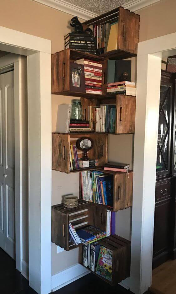 This creative crate corner shelf is perfect for adding both function and charm to unused spaces in your home. You can mount wooden crates in a staggered pattern, adjusting their placement to fit the wall layout and height you want.