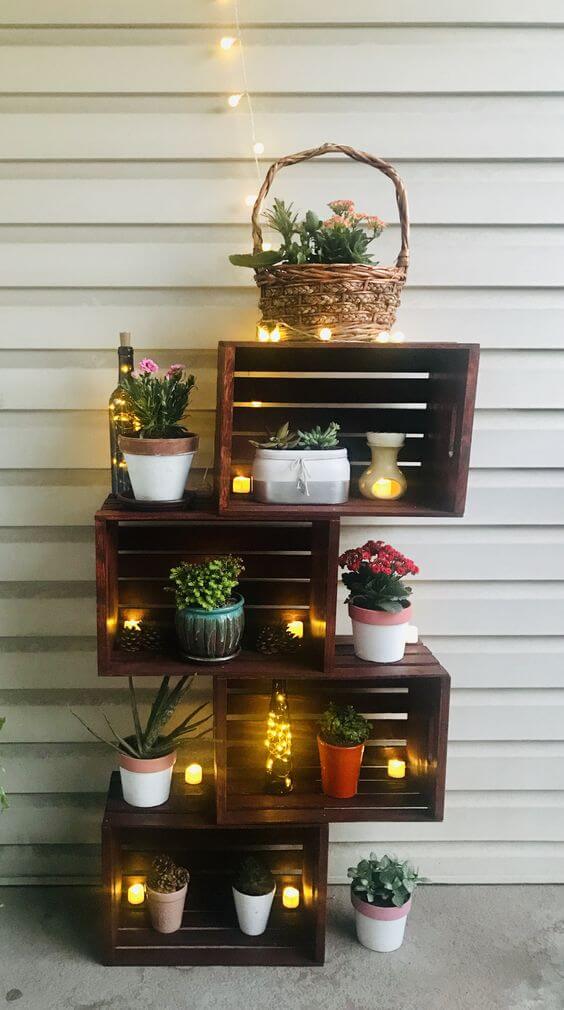 This glowing crate plant stand adds instant charm to any porch or patio. You can stack and stagger wooden crates to create a multi-level display for your favorite potted plants.