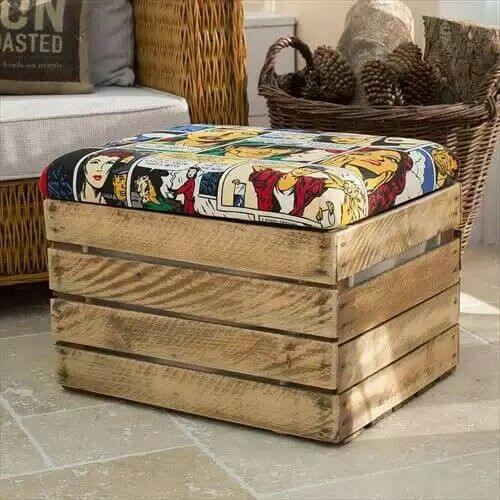 This crate storage box seat is both functional and full of personality. A sturdy wooden crate forms the base, while a cushioned top covered in colorful comic fabric turns it into a playful seating spot.