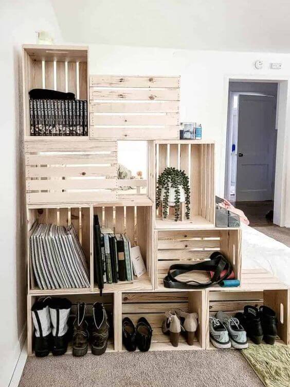 Each crate offers space for shoes, books, and decor, making it both functional and stylish. Sand and varnish the wood for a clean, modern finish or leave it raw for a farmhouse feel.