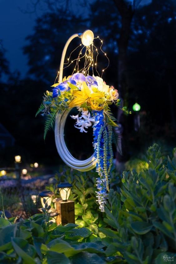 To make one, shape a hose into a wreath, secure it with wire, and decorate it with faux or fresh blooms. Add a strand of warm fairy lights, and you ll have a stunning piece that brightens your garden walkway after sunset.