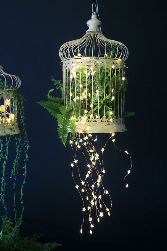Transforming an old birdcage into a glowing lantern gives your garden a touch of vintage magic. By filling the cage with greenery and weaving fairy lights through the bars, you create a soft, dreamy glow that looks stunning at night.