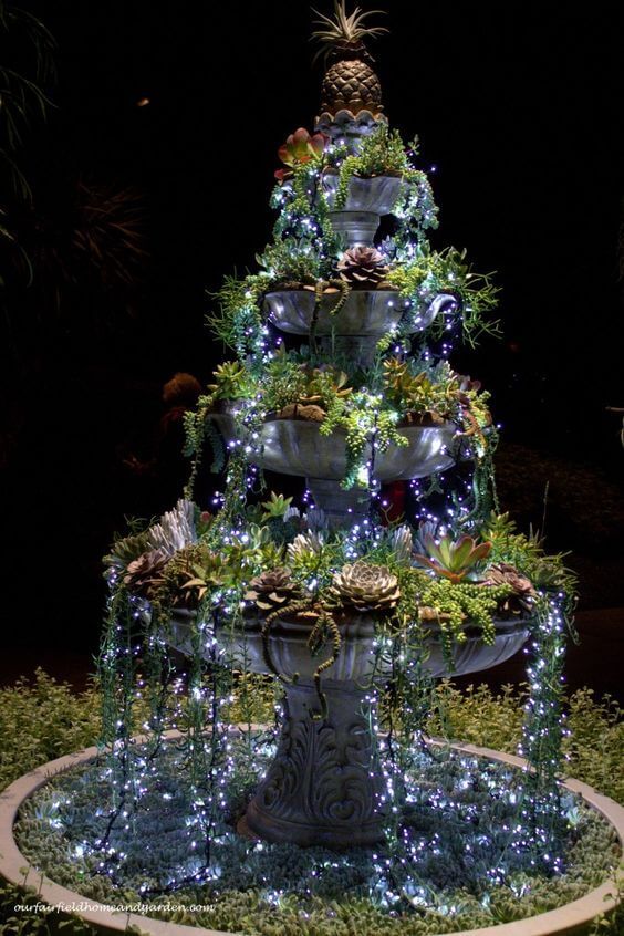 This tiered garden fountain has been transformed into a glowing tower of light and greenery. Draped fairy lights flow down like sparkling water, blending beautifully with cascading succulents and trailing vines.