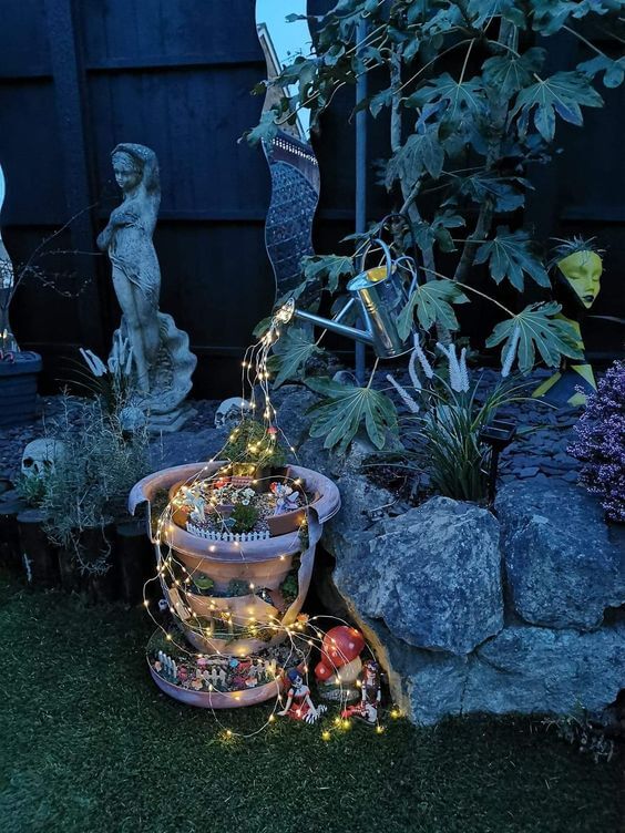 By attaching a strand of warm fairy lights to the spout and letting them cascade into a fairy garden display, you create the illusion of glowing water.