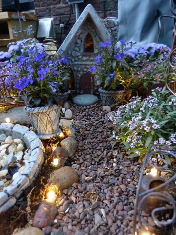 This tiny fairy garden feels alive with a touch of twinkling lights tucked along the stone path. The glow highlights the miniature house, flowers, and pebbles, making the whole scene look like something from a storybook.