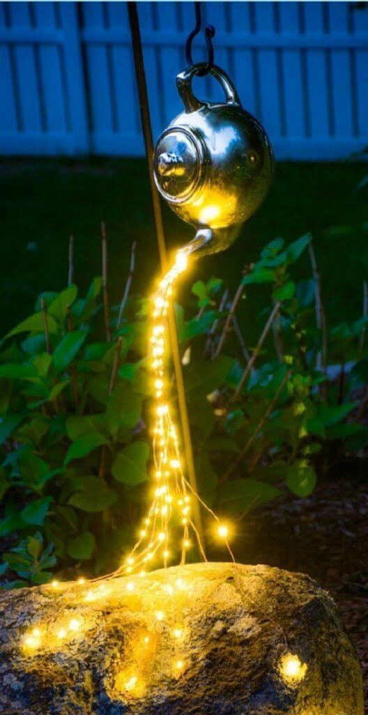 To recreate this, hang an old teapot or kettle from a sturdy hook, then thread battery-powered or solar fairy lights through the spout. Let the string spill onto a rock or into a planter, and you ll have a playful display that delights guests every evening.