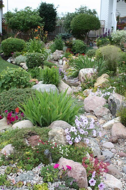 This design softens the rugged look of rock with bright flowers, grasses, and low-growing greenery tucked into the spaces between the stones.
