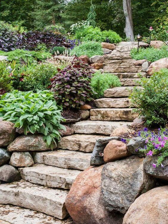 Each step feels organic, as though it belongs to the landscape, giving the garden a grounded, peaceful character. To build something similar, choose large, even stones for the steps and smaller rocks to secure the sides.