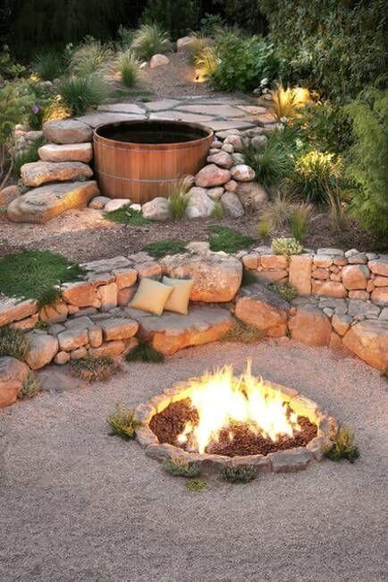 To recreate this, arrange boulders in a circle, leaving an opening in the center for the fire base, and fill the bottom with gravel or sand for safety.