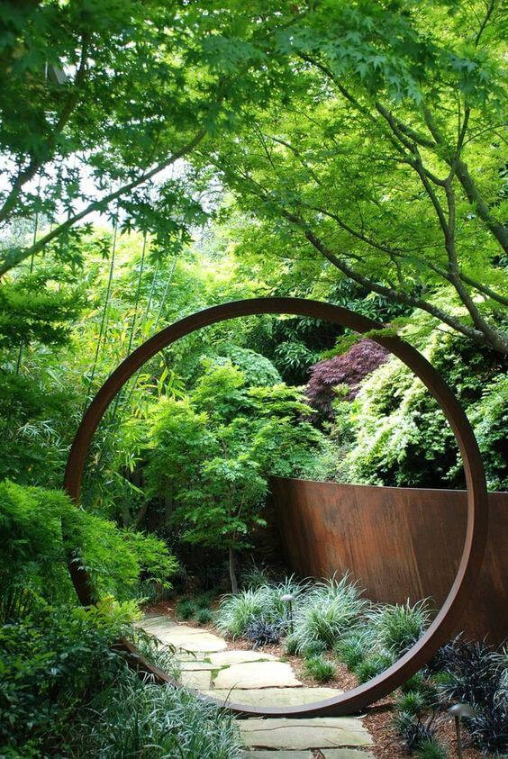 This corten steel garden gate is more like an art piece than just an entrance. Its circular design draws your eye in and frames the greenery behind it, making every walk into the garden feel special.