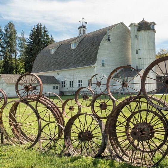 Old metal wagon wheels make a fence that feels both rustic and unique. You can line them up side by side or use them as accent panels between wooden posts. Their circular shape breaks up straight lines and adds vintage charm.