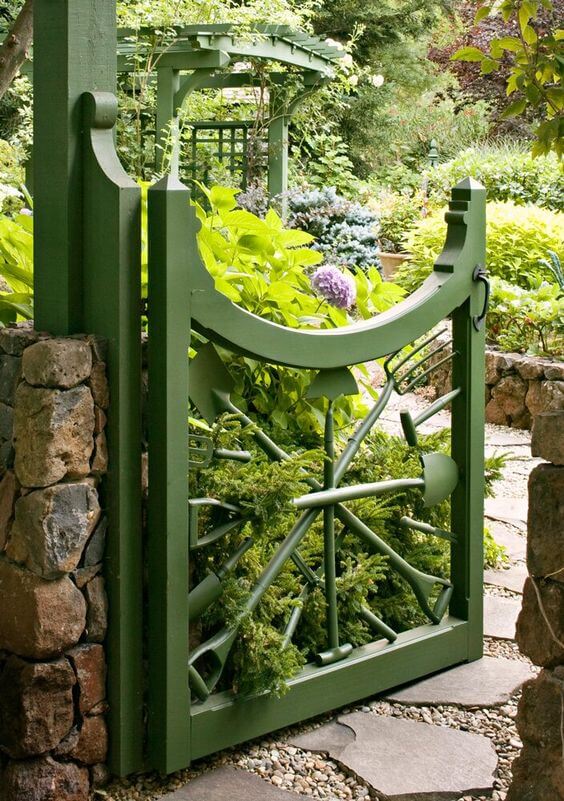 To create something similar, repurpose old tools, weld them into a decorative shape, and coat them with weather-resistant paint. Pairing it with natural stone or wood posts adds balance and makes the gate stand out even more.