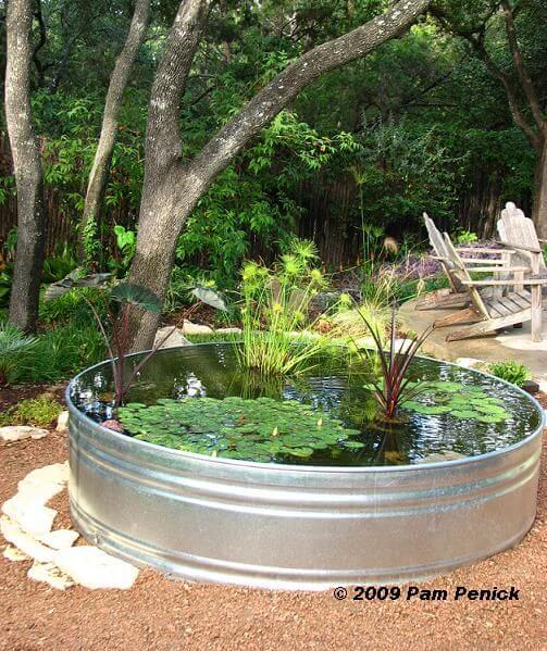 A large metal stock tank can be repurposed into a beautiful garden pond. Its size and depth make it perfect for water lilies, floating plants, or even small fish. Position the tank in a sunny spot and add a small fountain pump to keep the water fresh.