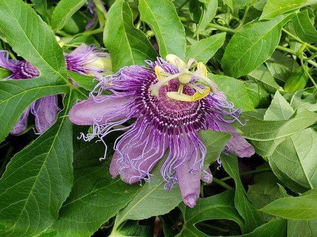 Purple Passionflower (Passiflora incarnata) is native to the southern United States. This climbing vine produces intricate purple flowers and edible fruit.