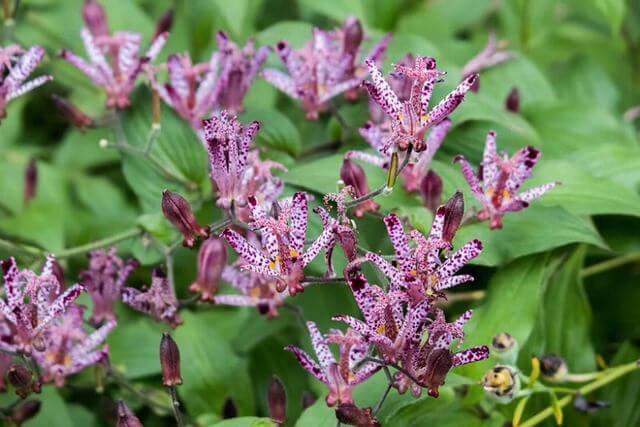 Toad lilies bloom when most summer flowers are fading. They prefer partial shade and moist, rich soil.