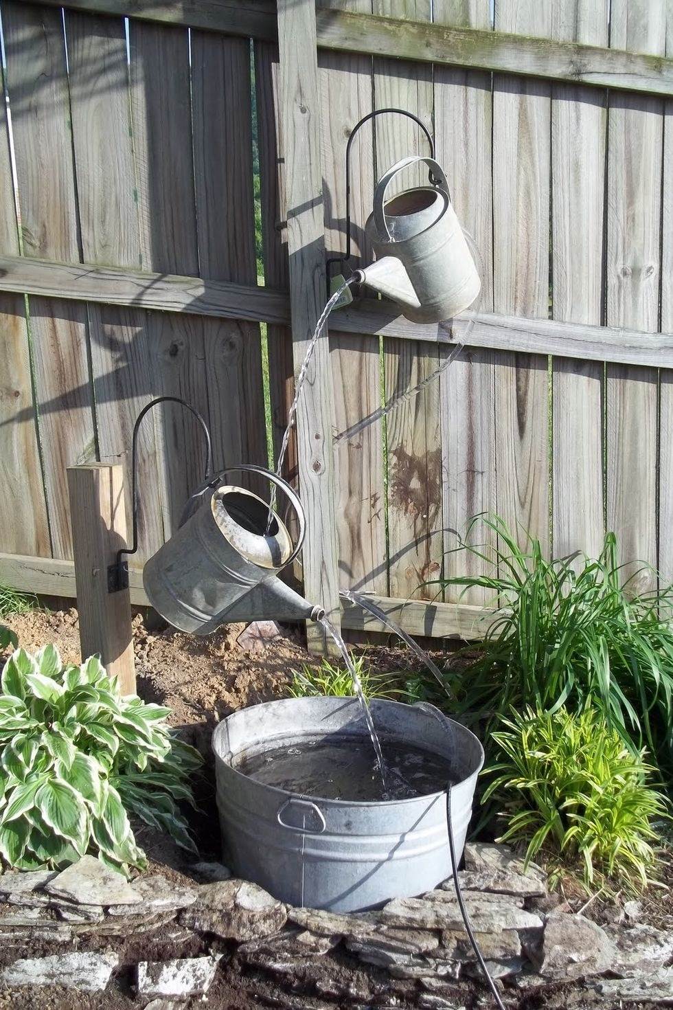 This stylish fountain is the ideal addition to a country garden. It was created from recycled watering cans and a trash bin.