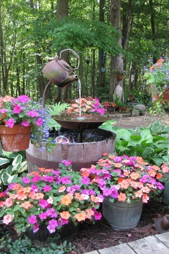 You can make a teapot fountain using an old or new teapot, a whiskey barrel, a gold pan, a fountain pump, and some tubing. The tubing should run through the tee, the flange, and the hole in the teapot.
