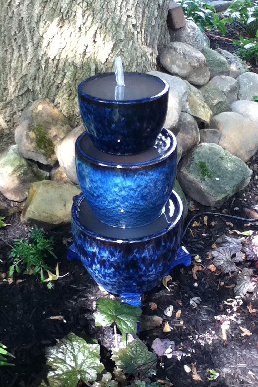 A blue planters waterfall can brighten your garden with its vibrant color. After drilling holes in the bottom of each planter,  attach the tubing to the water pump and thread it through the holes in the planters. The water pump should be placed inside the lowest planter, which will act as the reservoir for the waterfall.