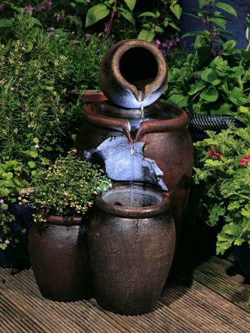 This fountain has the pots stacked on top of each other. You can plant some flowers or place pebbles around the fountain to add a vibe of zen.