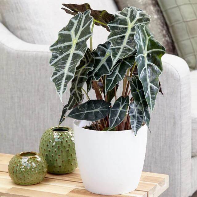 Rich, velvety leaves with white veins give this Alocasia a moody, elegant vibe. It’s a humidity-lover, so a bathroom or pebble tray works wonders.