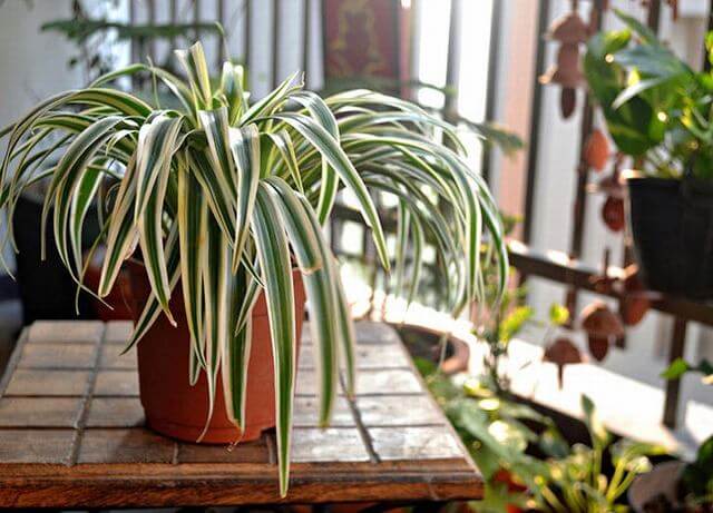 The spider plant brings easy charm with its fountain-like leaves streaked in white and green. It looks especially cheerful when cascading from a hanging basket or perched high.