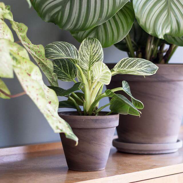 True to its name, bold white stripes zip across its lush green leaves. It craves warmth and high humidity, so a humidifier can help during dry months.