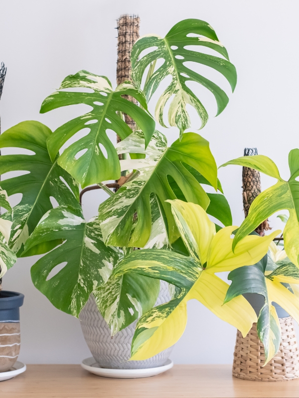 Dramatic, bold, and sculptural, this philodendron turns heads with its white-and-green variegation. It climbs beautifully, especially with a moss pole.