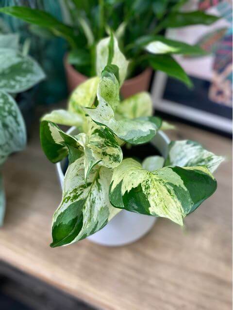 This pothos handles low light but thrives in bright, indirect sun. Water it when the soil feels dry to keep it growing strong.