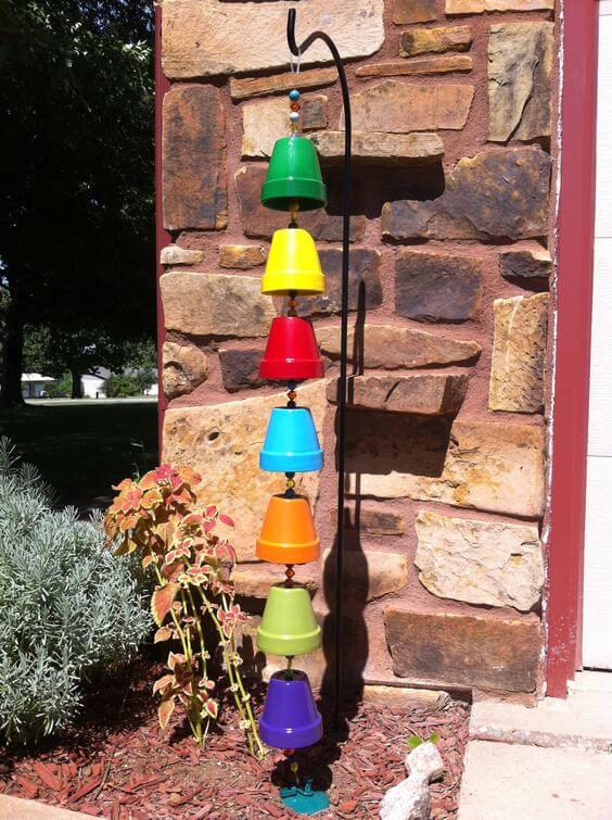 Paint several small pots in cheerful hues using outdoor acrylic paint, then thread them through a sturdy chain or wire. Space them evenly to let water flow smoothly through.