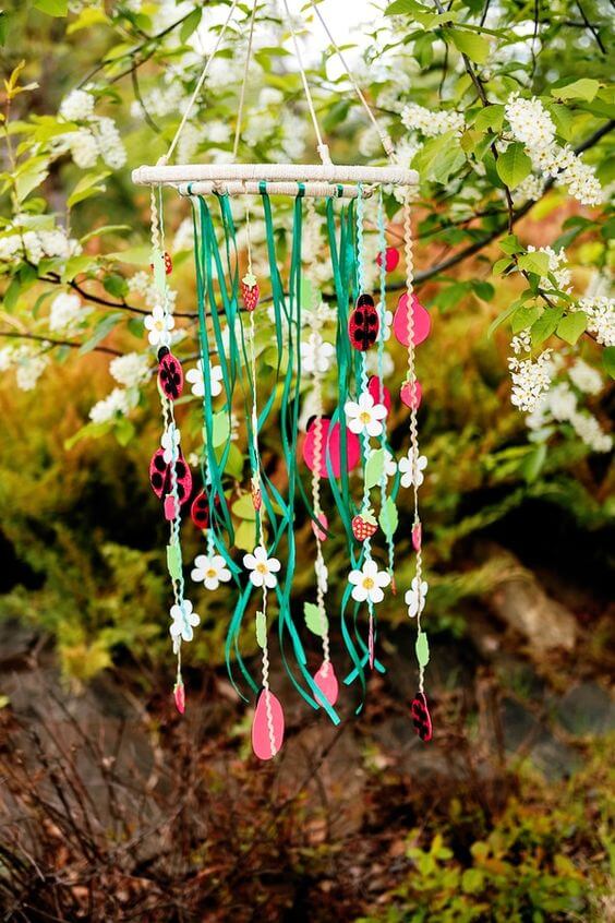 To make one, wrap a wooden or metal hoop with twine, then tie long ribbons, artificial flowers, and paper shapes in cheerful hues. Mix different textures for a more playful look, think satin ribbons, fabric daisies, and tiny felt ladybugs.