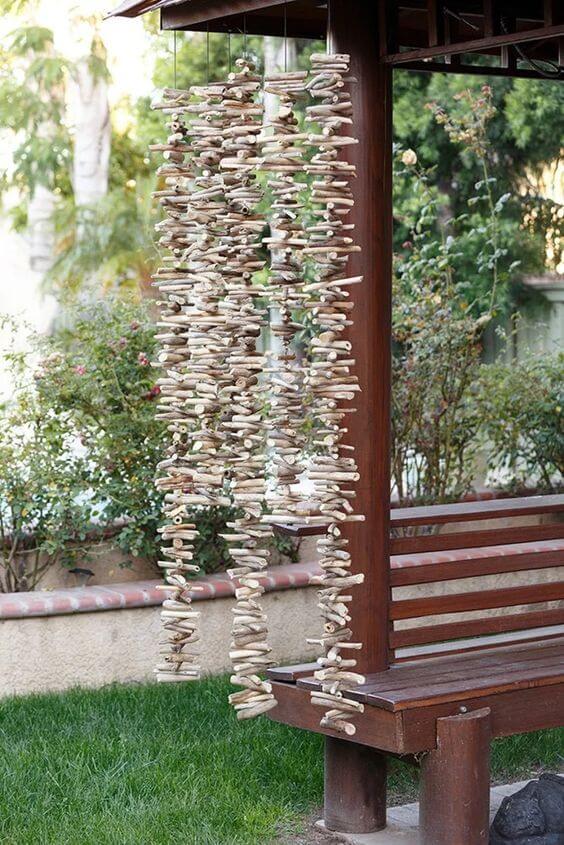 This hanging driftwood decor brings coastal charm and earthy texture to your outdoor space. Strung together in vertical lines, each weathered piece catches the breeze and adds a rhythmic, soothing motion.