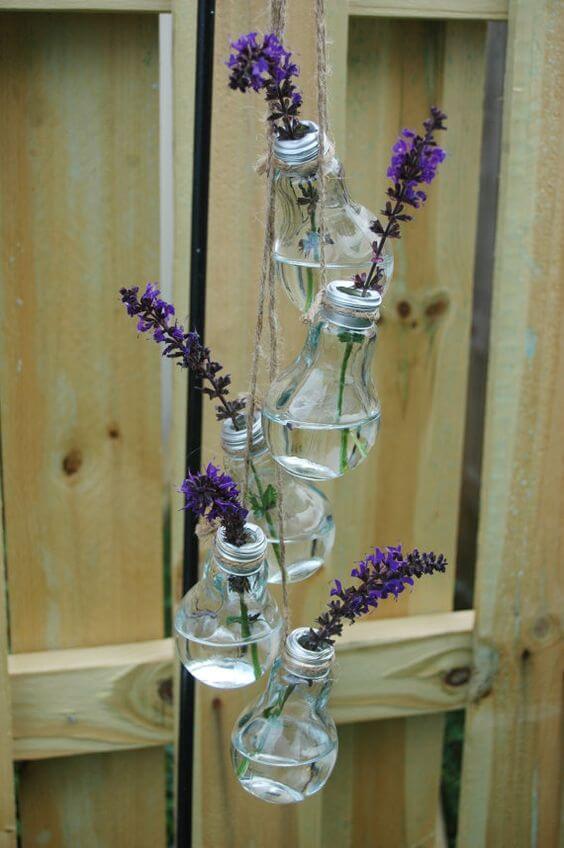 Give used light bulbs a new purpose by transforming them into delicate hanging vases. This creative upcycling idea brings a touch of eco-chic elegance to your garden.