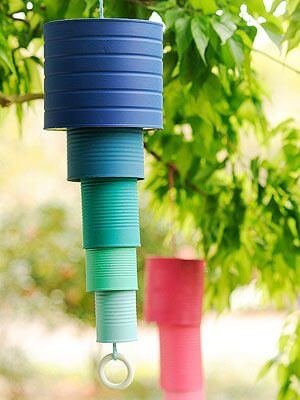 Start by cleaning and drying different-sized cans, then paint each one in shades that complement your garden. Once dry, drill small holes in the center of each and thread them together using a strong cord or rope.