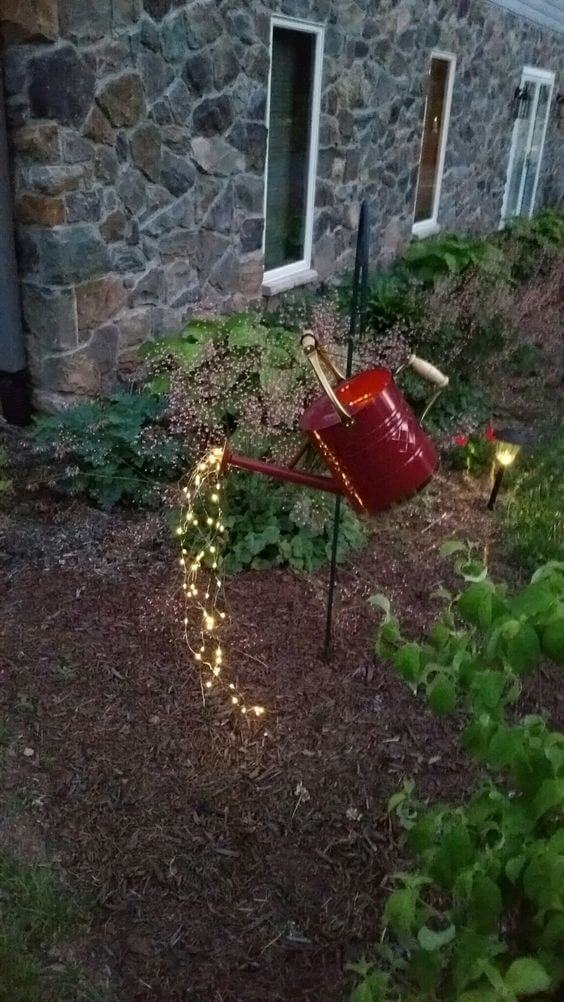 You ll love how it brightens the space while keeping that rustic, handmade charm. Hang the watering can from a sturdy shepherd s hook and thread delicate string lights through the spout so they cascade downward.