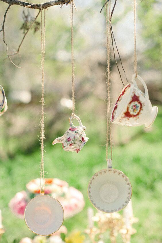 You can use mismatched thrifted china to give it character and a cozy cottage feel. Simply tie sturdy jute or fishing line around the handles, then hang them from a branch or pergola.
