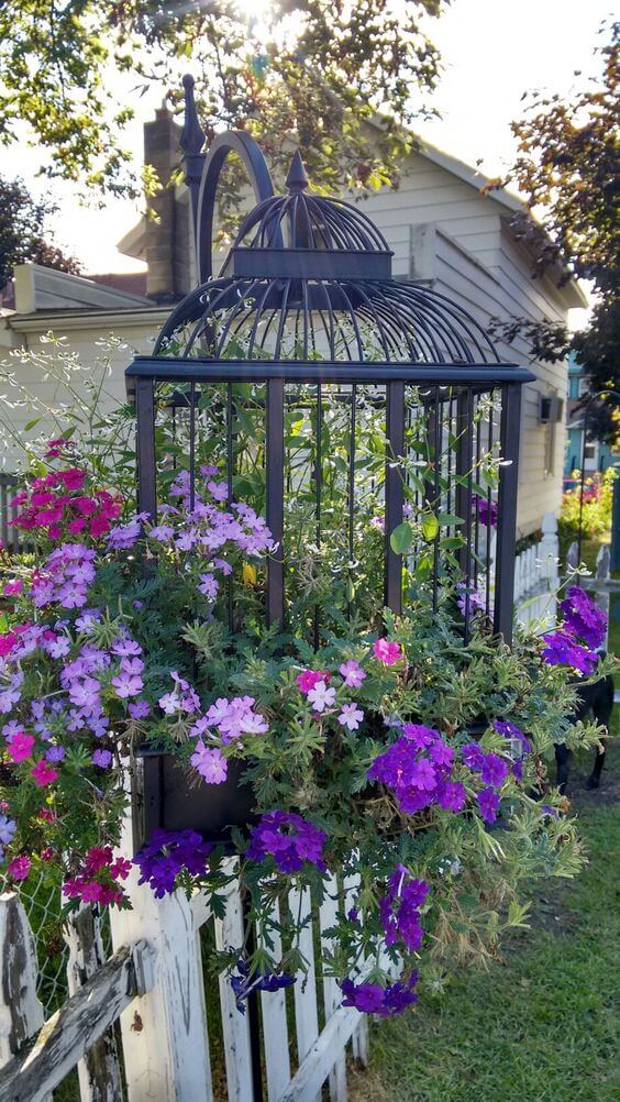 Simply line the bottom of the cage with coco fiber or moss, fill it with potting soil, and plant colorful trailing flowers like petunias or verbena. Hang it from a sturdy hook where sunlight filters through the petals.