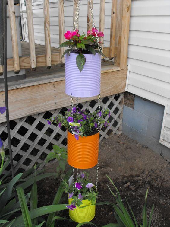 Punch small holes in the bottom for drainage, and use sturdy chains to connect and hang them vertically. Fill each can with potting mix and your favorite blooms like impatiens or petunias.