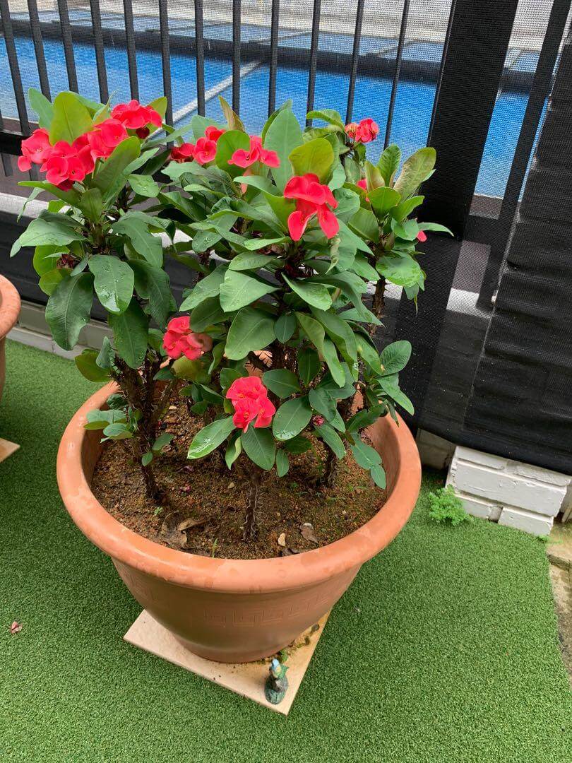 Crown of Thorns keeps blooming all time if exposed to the full sun but it also is the best shade succulent, and you will see green leaves instead. You can grow it both indoors and outdoors.