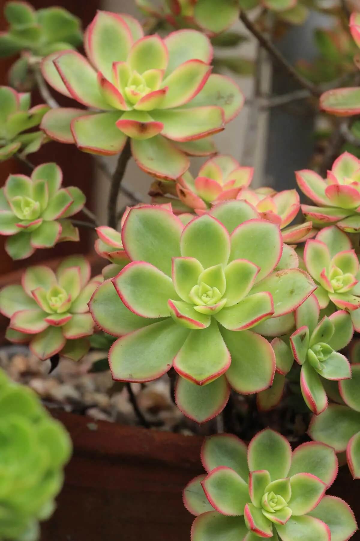 Kiwi Aeonium is a tough succulent and has a brilliant shade of red. It bears rosettes that are formed by fat spoon-like leaves and are pale yellow at the center, then will turn green outwards, near the edges. It grows well in partial shade in cool climates and full shade in warm climates.