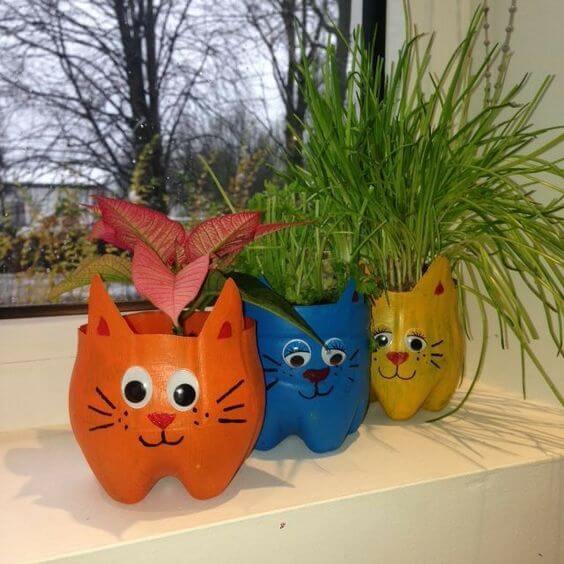 Each planter holds small plants, creating a fun mix of greenery and creativity. To make your own, cut the top half of a plastic bottle, shape the ears, and paint it in bright, bold colors.