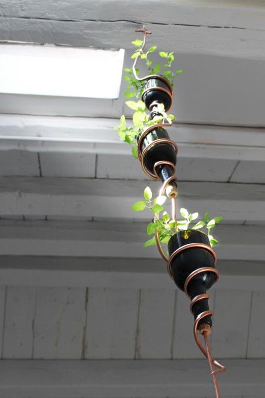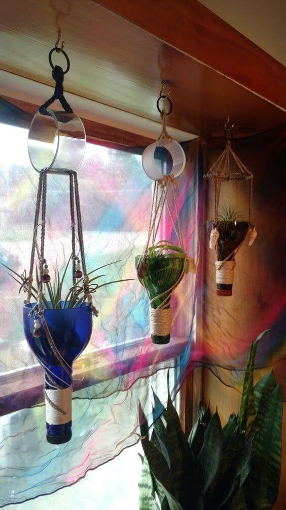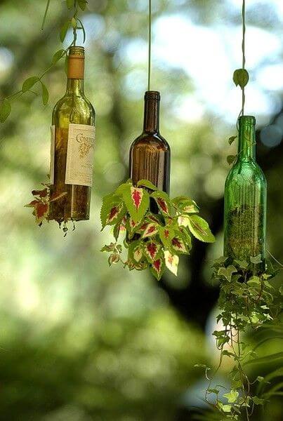 Turning wine bottles into upside-down planters is a clever way to grow trailing plants indoors. Simply cut the base of the bottle, insert a small plant with moss to hold the soil, and suspend it securely with wire or a strong cord.