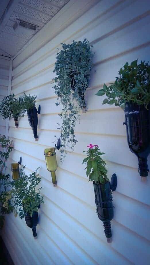 The different plant varieties add depth and a pop of color, turning a simple boundary into a striking garden feature. To make your own, secure bottles to a frame or wooden support and fill them with cascading plants or herbs.