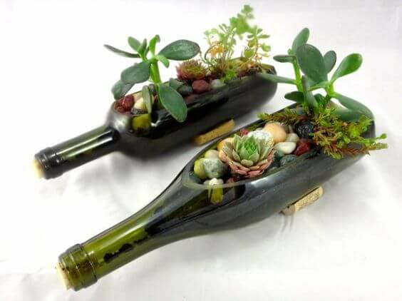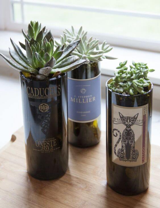 Wine bottles make stylish and eco-friendly planters when cut and repurposed with a smooth edge. Their tall, narrow shape is perfect for succulents or trailing plants that don t need much soil.