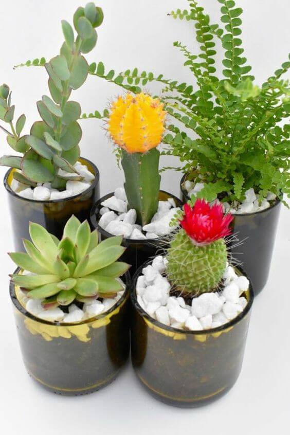 Cut wine bottles make chic little planters that instantly upgrade the look of your succulents and cacti. The dark glass creates a striking backdrop for vibrant greens and colorful blooms, making each plant pop.