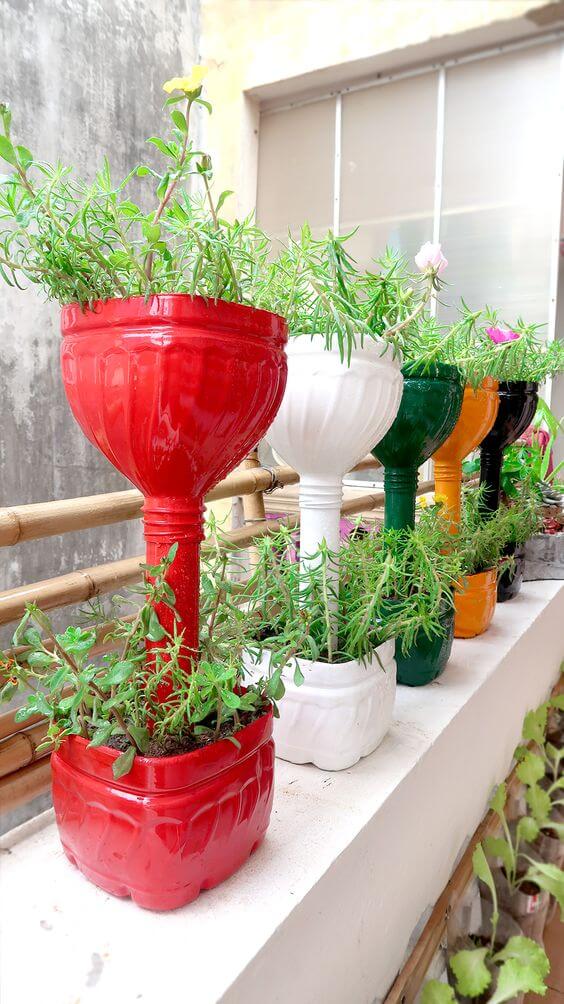 Bright spray paints in red, white, green, or yellow give the bottles a fresh new look, adding cheer to balconies or windowsills. Drill a few holes at the bottom to allow water to drain properly.