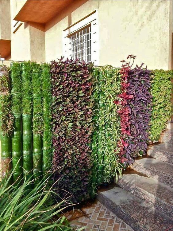 This idea is perfect if you want to grow fresh food but don t have much ground space. Plastic bottles are stacked vertically and attached to a wall, each holding soil and a healthy vegetable plant.