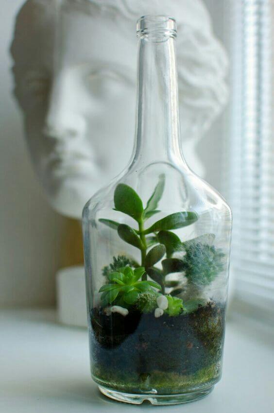 Succulents thrive in shallow soil, so these bottles provide just the right amount of space. Add a bit of moss or pebbles to help with drainage and texture.