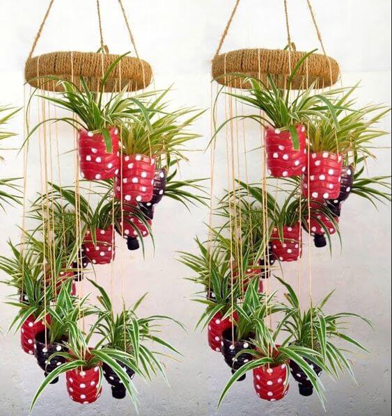 To make your own, cut plastic bottles in half, paint them with bold colors, and let them dry fully before planting. Attach ropes or strings to hang them from a circular frame, creating a cascading effect.