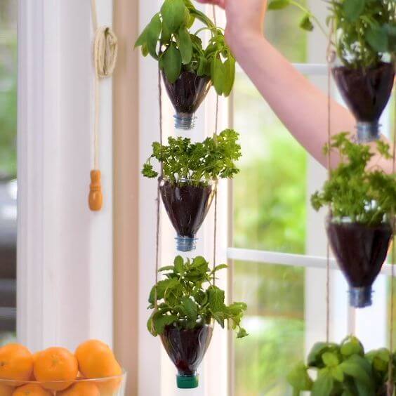 Plastic bottles can be reborn as simple herb planters. Cut them in half and poke holes at the bottom for drainage. Use the top half inverted into the bottom for a self-watering system.