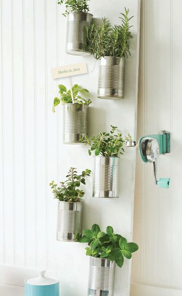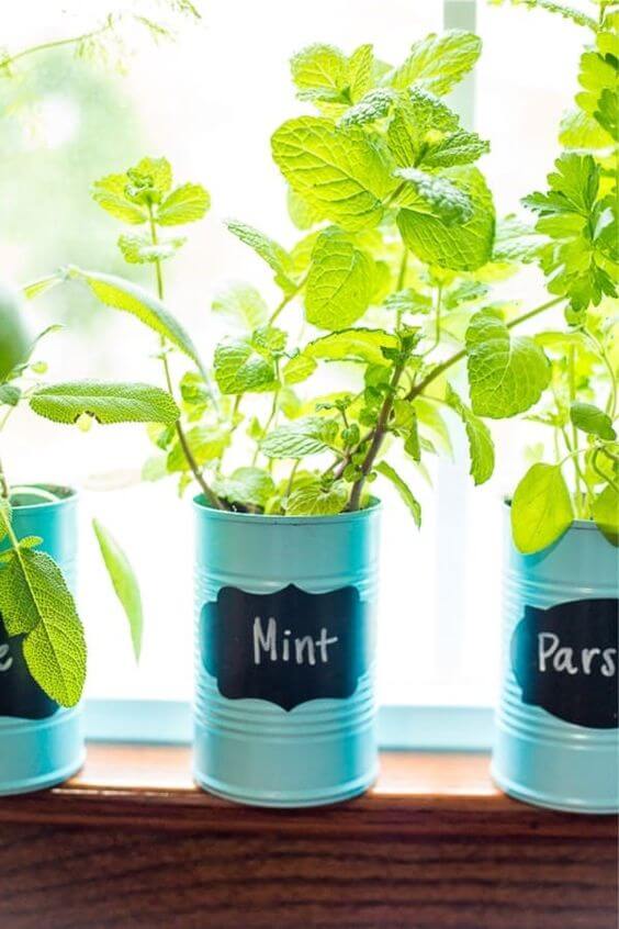 Empty tin cans make perfect homes for small herbs. Clean them thoroughly and punch a few holes at the bottom for drainage. Paint or wrap them with fabric to match your kitchen or balcony style.